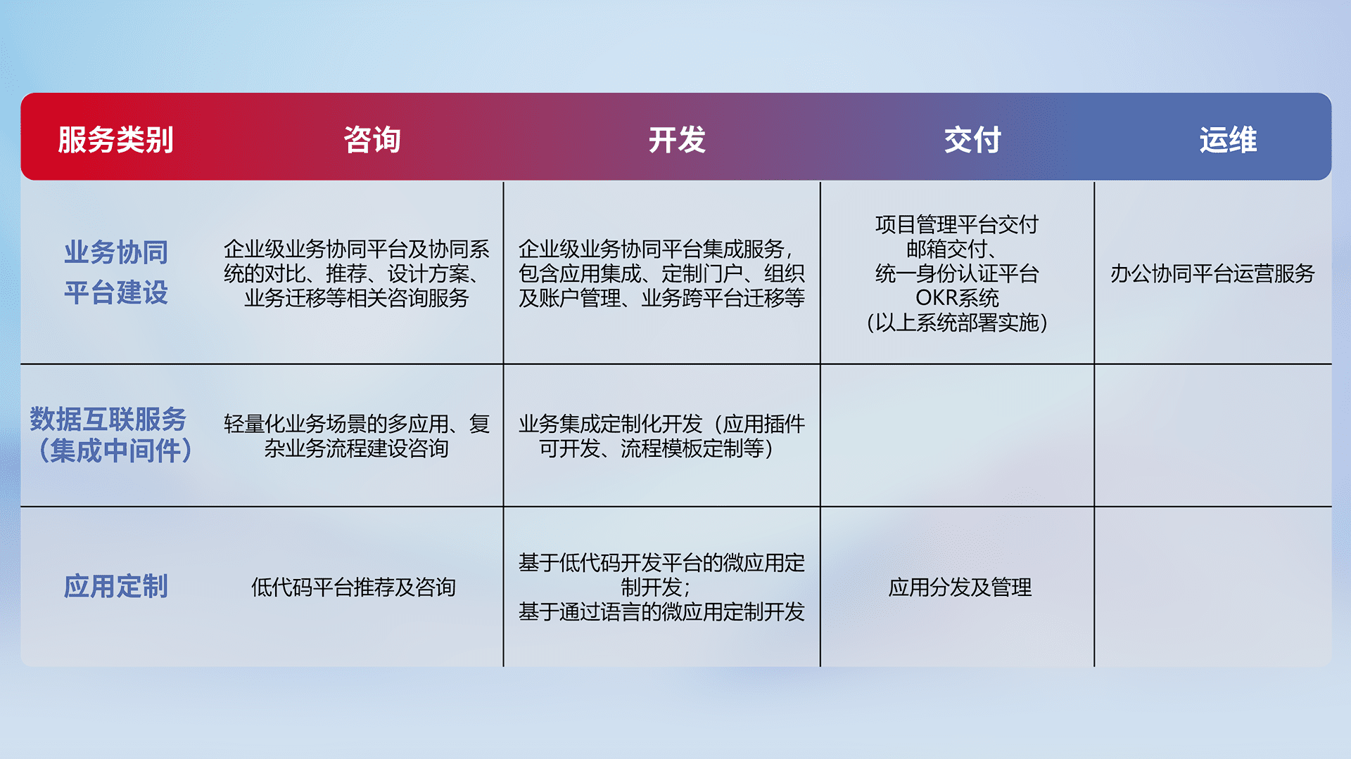 针对钉钉、、、、企微、、、IDaas等平台级产品提供产品的规划、、方案、、交付、、、、定制化开发等服务,,,,实现如统一协同办公、、智能客户服务、、、混合会议管理、、、、智能数据查询、、、等业务场景,,,实现数字化转型。。